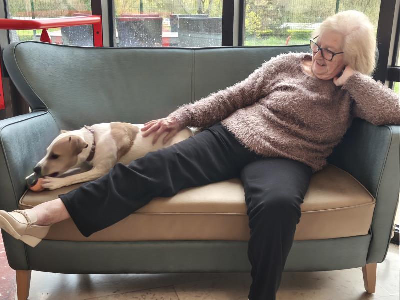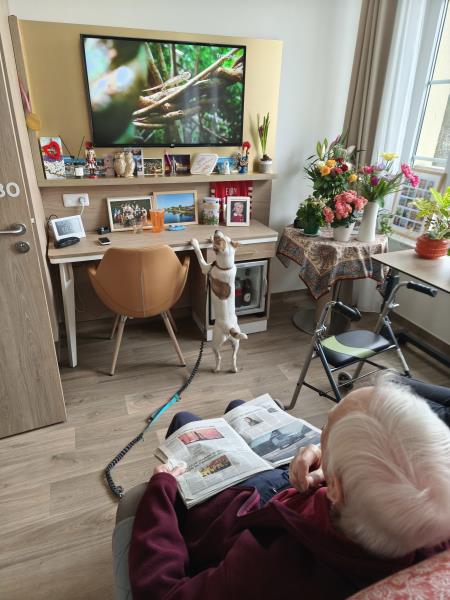 Le chien médiateur est un compagnon qui partage le quotidien des résidents. Il s'adapte à leur mode de vie et semble avoir les mêmes centres d'intérêt pour le confort et le divertissement ! Chacun y trouve son compte dans cette relation sincère : affection, jeux et moments partagés. Une relation d'amitié à la fois apaisante et vivifiante selon les jours.