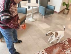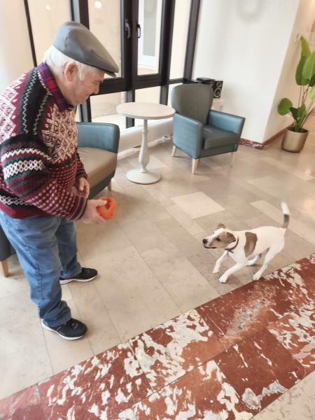 Cela fait désormais un an tout juste que Sherlock intervient comme chien médiateur dans la résidence, et il prend son rôle très au sérieux: ce matin, il a profité de l'espace disponible de l'Unité de Vie Protégée pour s'adonner à une partie de jeux de balle endiablée avec les résidents. Un moment plein de joie, d'énergie et de complicité partagée.